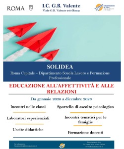 A partire da gennaio 2026, SOLIDEA – Contro la violenza di genere è attivo presso l’I.C. G.B. Valente, grazie al finanziamento del Dipartimento Scuola, Lavoro e Formazione di Roma Capitale. Il progetto è realizzato attraverso un percorso di co-progettazione con il Dipartimento, in collaborazione con il Municipio V e con il contributo di esperti dell’Università La Sapienza di Roma, all’interno di una rete territoriale orientata alla diffusione di buone pratiche educative.