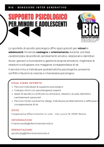 La scuola rappresenta un contesto privilegiato per la prevenzione del disagio giovanile, poiché consente di attivare interventi tempestivi e mirati, capaci di intercettare precocemente segnali di malessere individuale e relazionale. In questo quadro si inseriscono i laboratori socio-affettivi nelle classi del progetto B.I.G.! Condotti da esperti/e sul lavoro con l’adolescenza: non sono semplici attività educative, ma interventi strutturati che permettono di far emergere bisogni, fragilità e dinamiche relazionali spesso difficili da comprendere. Il lavoro svolto in classe favorisce una maggiore consapevolezza emotiva e consente di intercettare il malessere prima che diventi disagio permettendo di attivare percorsi specialistici di supporto psicologico come quelli forniti dagli psicoterapeuti di Rifornimento in volo!